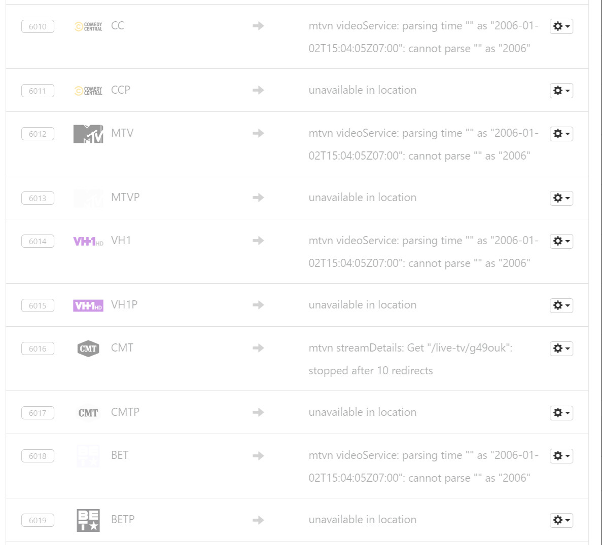 2024/06/05 23:08:46.600673 [ERR] Failed to start stream for ch6010: TVE: mtvn videoService: parsing time "" as "2006-01-02T15:04:05Z07:00": cannot parse "" as "2006"