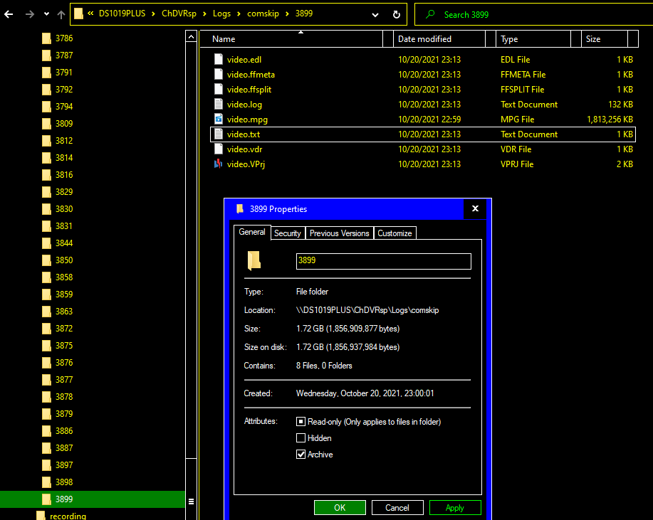 This is a view of the directory Logs/comskip/3899 on my Synology NAS, viewing it from my Windows 10 PC