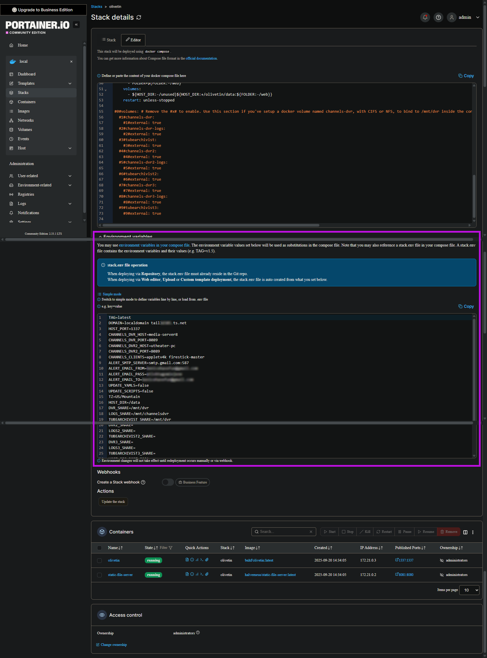 You might want to stop and then delete your current olivetin stack, then paste in the Docker Compose I posted above into its part of the Editor, and then paste in the env vars into their part of the Editor, followed by the adjustments described above to only what's in the Environment variables area.