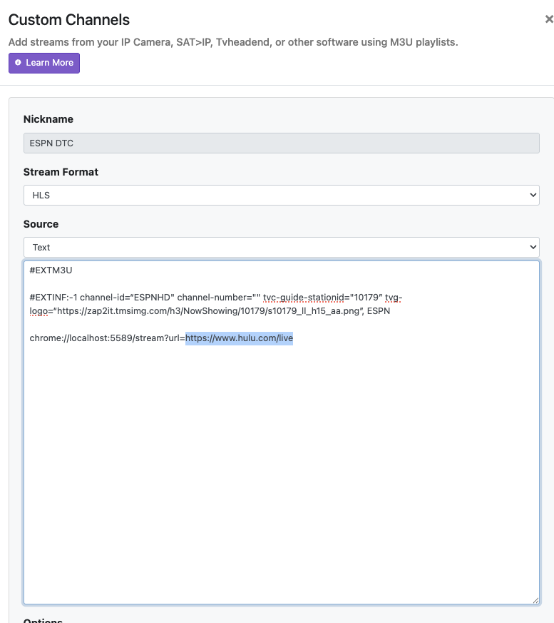 I set "chrome://localhost:5589/stream?url=" to "https:// www.hulu.com/live"