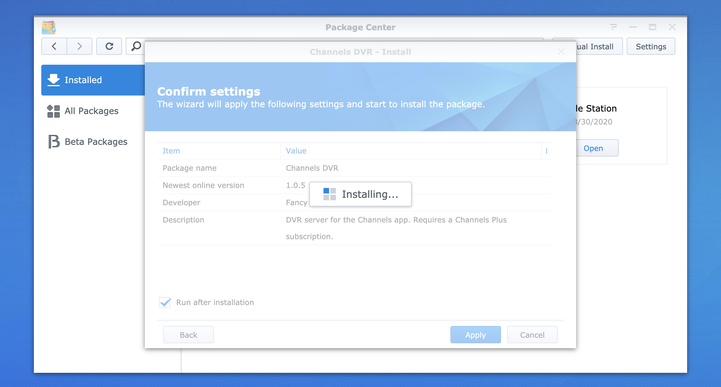 I have a Synology DS218+ that channels quit working on today. I wiped the NAS and I am now trying to install Channels DVR from the install file off the site and it starts the install but the screen that is attached is where its sitting now and has been for the past 20 min.