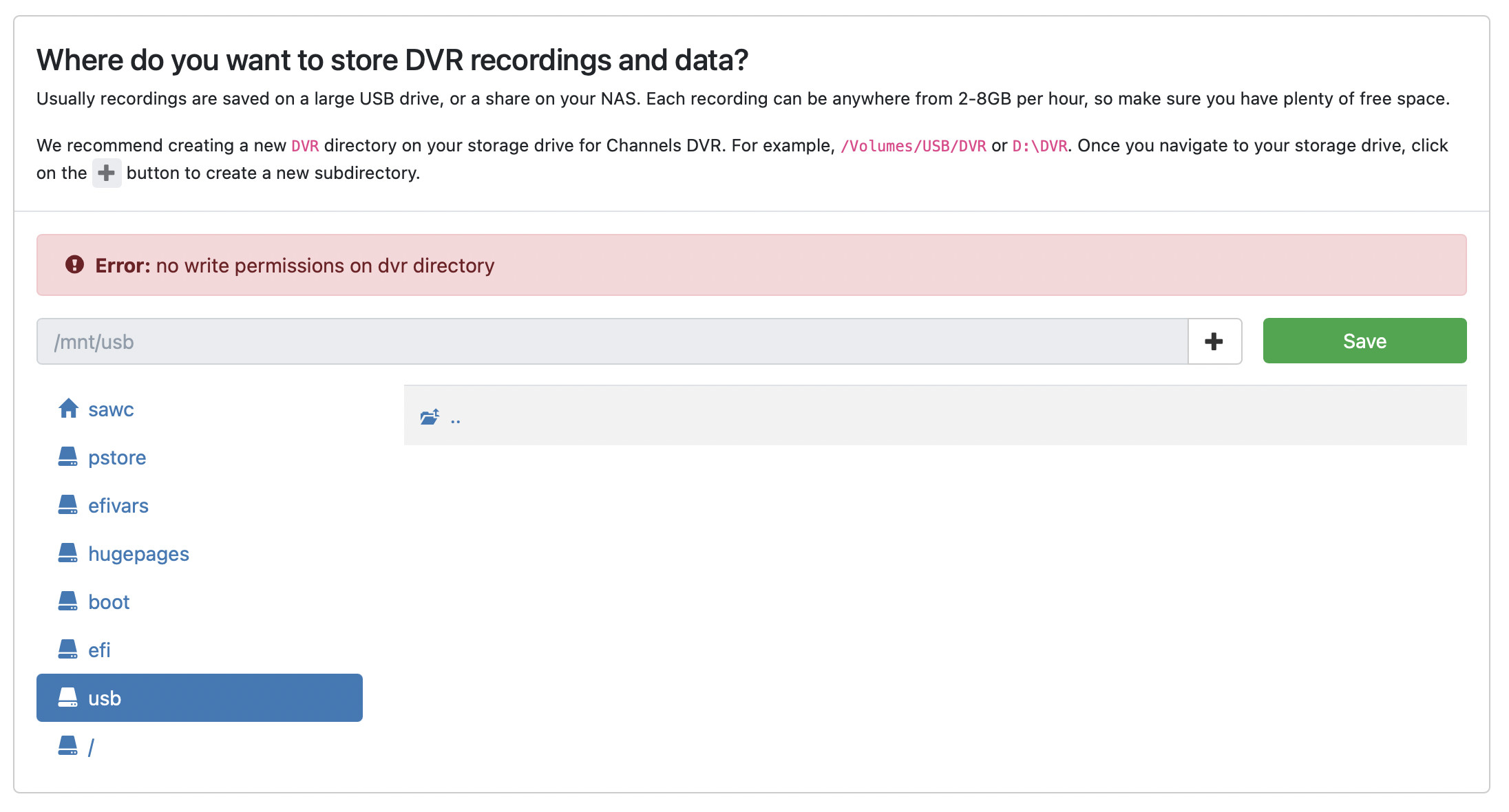 I setup a server with Ubuntu 20.04 and would like to take the USB drive I am currently using for my Channels DVR via a Raspberry Pi 4 and just restore the config and shows. I am new to Linux so I am struggling to get the USB drive mounted in a read/write mode. I got it mounted with some fstab settings I found but I get an error when I am at the step of where to store DVR recordings and data. I am trying to pick /mnt/usb/ and it tells me Error: no write permissions on dvr directory