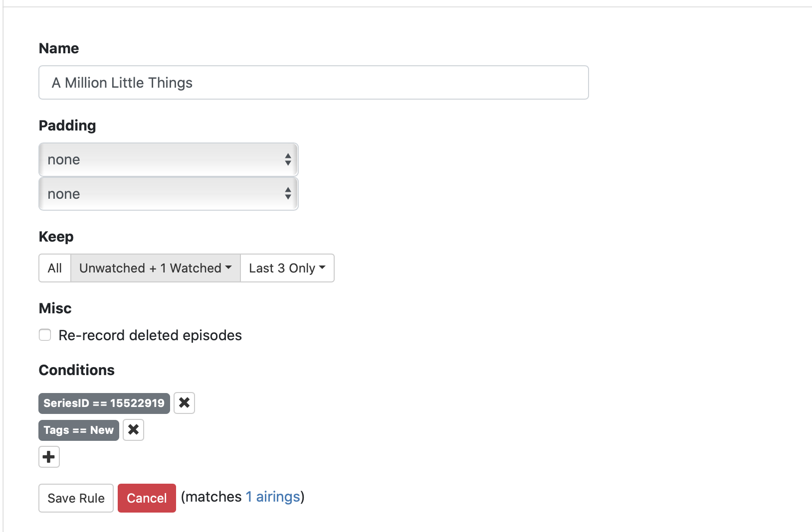 Add additional feature would track the meta data for episodes so that I could run through the watched (and deleted) episodes for reference, marking episodes to be re-recorded (should they be rebroadcast). That's a long shot, requiring some waiting, but should be easy to implement.