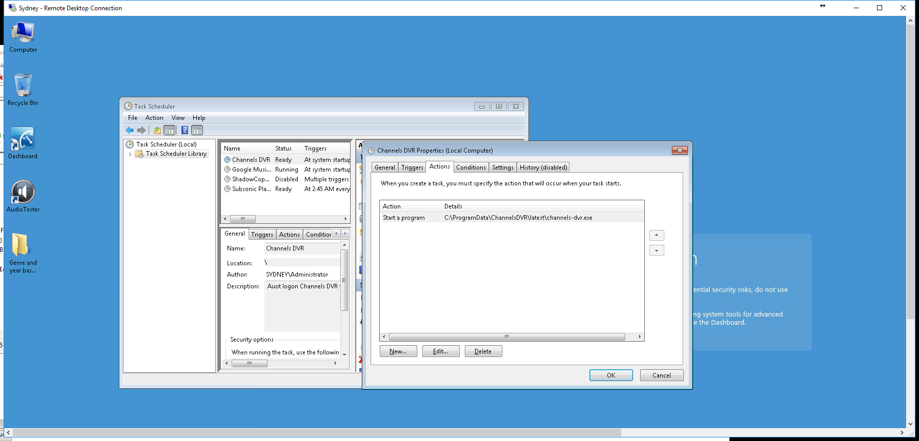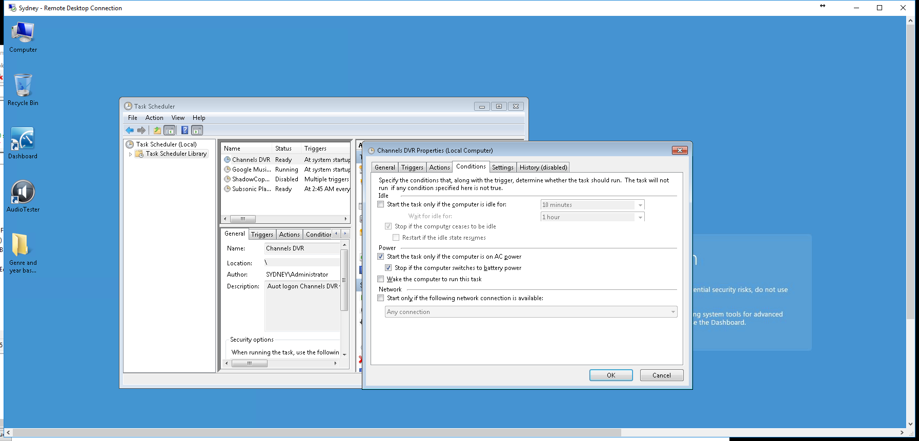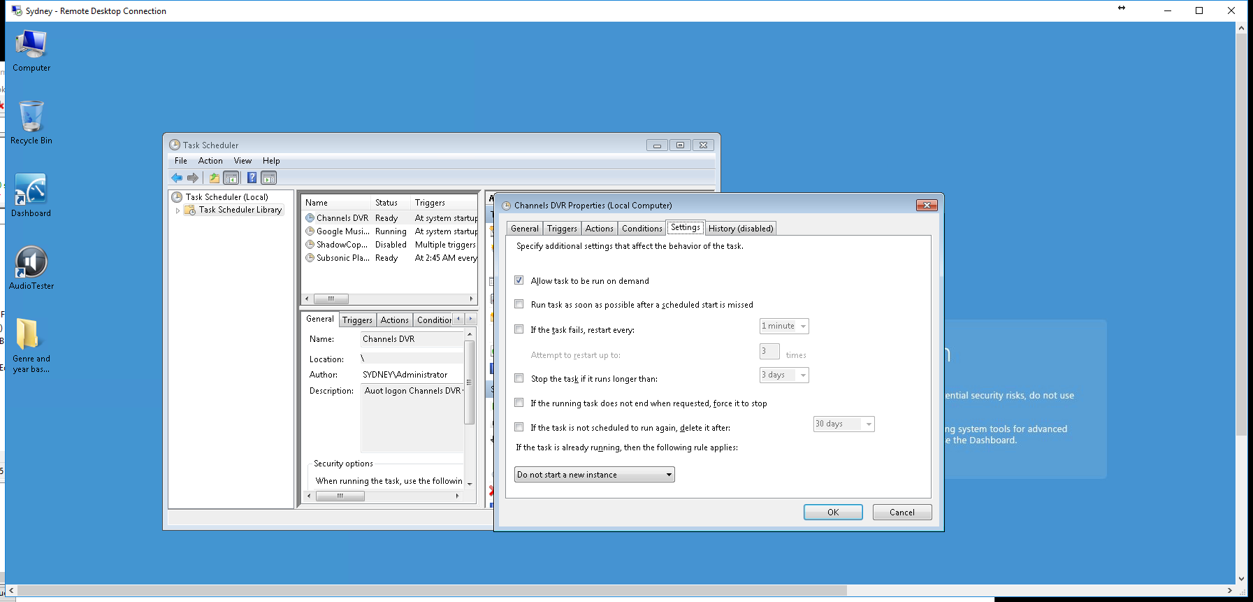 I just finished watching a recorded show and as soon as I backed out of it on my ATV the recording folders showed no available recordings. I looked at the server web site and it looks like it was hung up. I rebooted the server and the same thing. The recording tab is there but it shows no recordings… unless I login to my Windows Home Server 2011 and keep the remote desktop open. This is a headless server that has been running great with Channels DVR for some time now. I added a task scheduler auto-start and it has worked perfect for me all along. It looks like there was an update tonight and I suspect it is buggy. When I try to log off of my server it says that Channels DVR engine is running (even though the web page says idle and it’s not recording anything) and it won’t close when I try to, I have to force close it. It has never done this before. If I go look at my task scheduler after the server starts it shows the channels auto-login as “ready” instead of “running”.