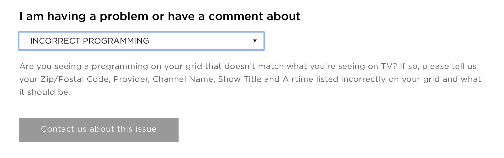 You can report guide issues on Zap2it Feedback under "INCORRECT PROGRAMMING"