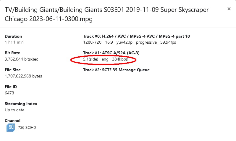 The other intersting thing is that I have files recorded where dd 5.1 is detected by my receiver if I am using kodi to play it. I see from the display that it detects the file and I can hear the differnece in the quality of the sound. Channelsdvr cannot detect it however, especially after it converts it to mpg.