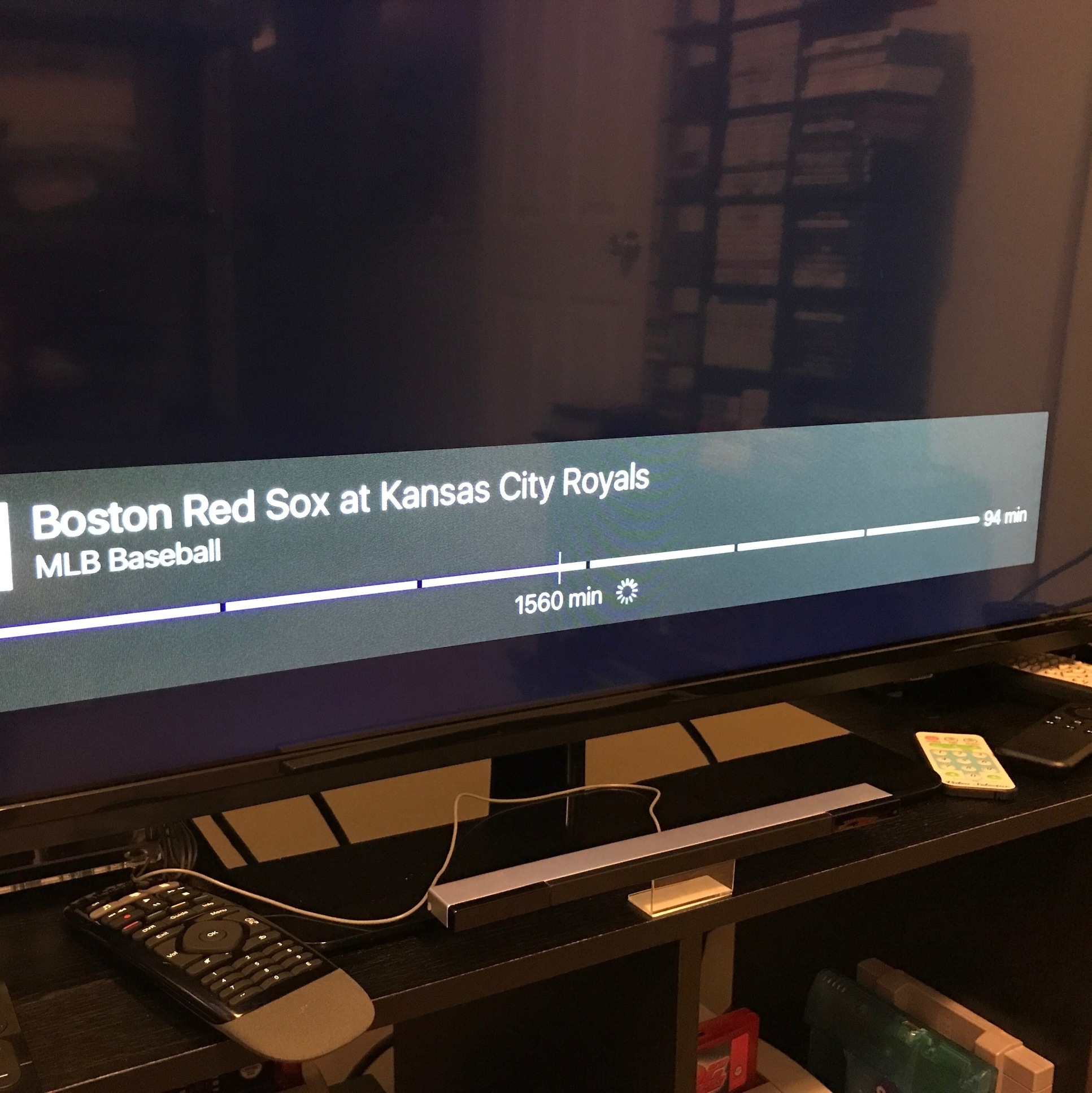 I have the Red Sox game recording, and I start watching it a little while after it starts. After watching the game for a while, I leave it and go watch a different show (live channel) for a while. I go back to the Red Sox game to resume where I left off, but instead of resuming where I last left off, I get a black screen and the scrubber marker showing that it's currently at some ridiculous time marker (like, in the area of 1500 minutes) with a spinning wheel next to it. Pressing the play/pause button does nothing. Leaving the recording and going back does nothing, and force closing the app and going back in does nothing. The only thing that seems to do anything is pressing fast forward once, which kicks me back to the very beginning of the recording.