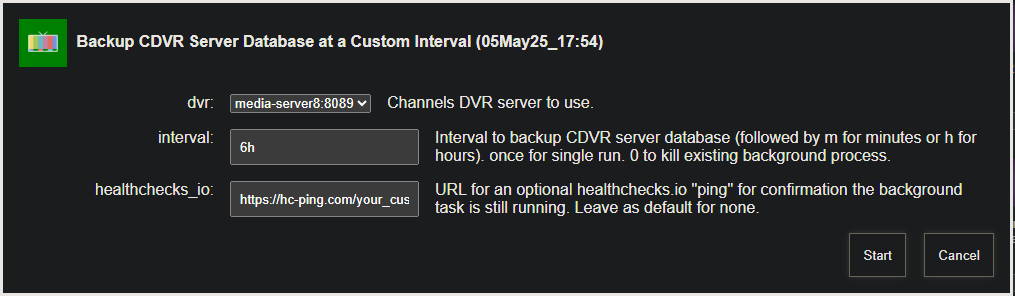 You can leave the healthchecks.io value as the default. Click Start then refresh the browser after the Action window closes. Does its icon turn green?