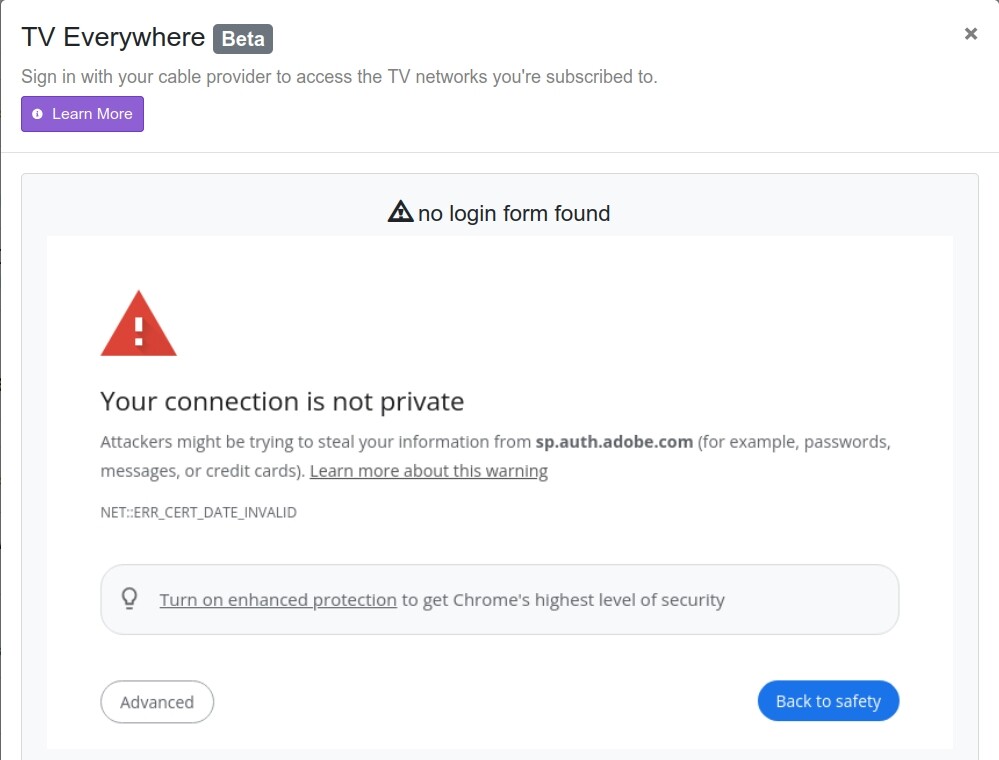 I tried 4 different browsers just in case. My password is correct. I can get to channels live on the web (the NBC check). I end up getting this image talking about an expired cert: