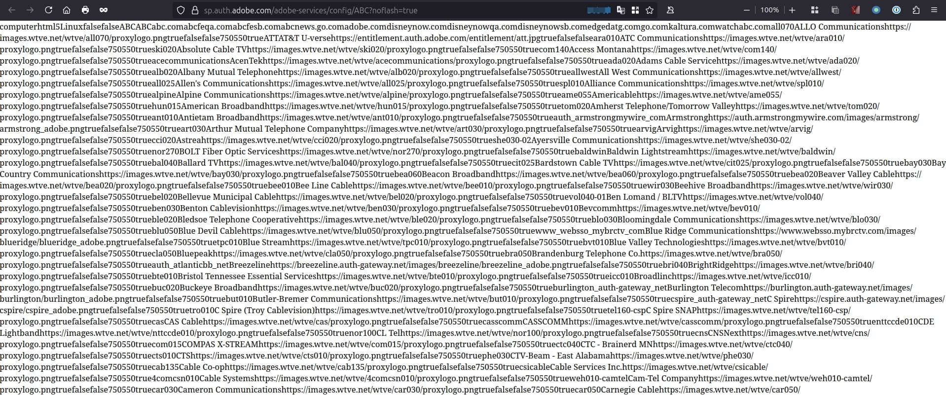 Here is what I see when I go with Firefox to https://sp.auth.adobe.com/adobe-services/config/ABC?noflash=true