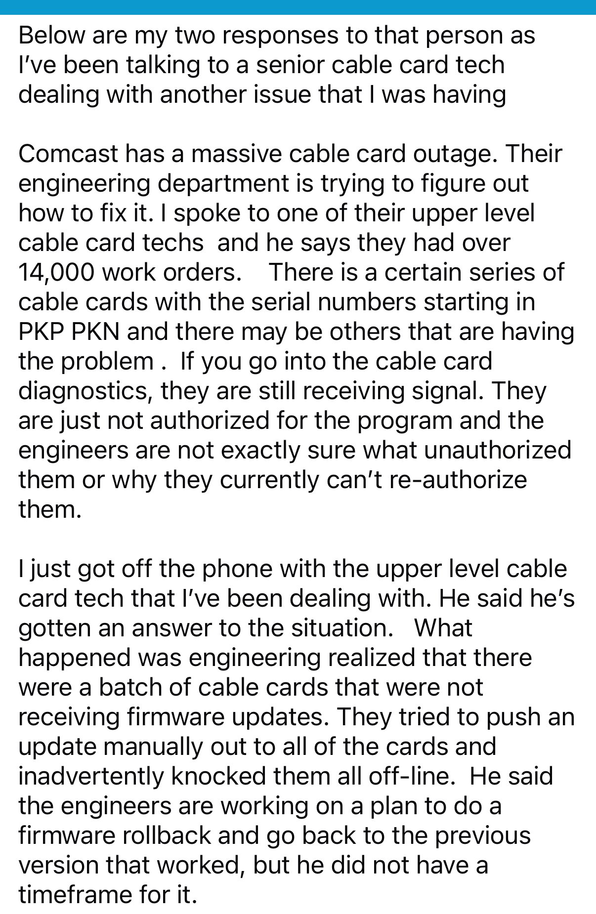 FYI A few months ago, in response to Comcast announcing they would no longer replace failed Cablecards, I read somewhere from a tech that Comcast is starting to upgrade other infrastructure in November that would render Cablecards useless. That’s consistent with what I’m seeing. Probably not coincidentally Comcast had brought down our entire neighborhood for a day to provide network upgrades just before my CCs stopped working.