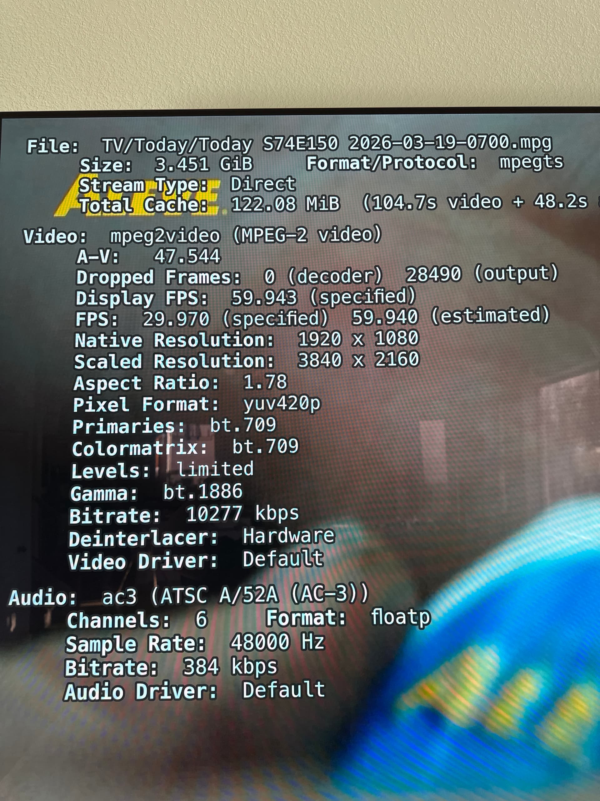 OTA dropping massive amount of frames. Started happening several weeks ago (during Olympics is when I first noticed). Consistently happens on any OTA station if I leave it playing for an hour or so. In this screenshot, I was recording a live event, watching it maybe half hour behind live, and it started dropping frames to the point where audio and video were out of sync by 30 seconds or more. The recording seems to be fine (I can scrub back and it starts playing back great again).