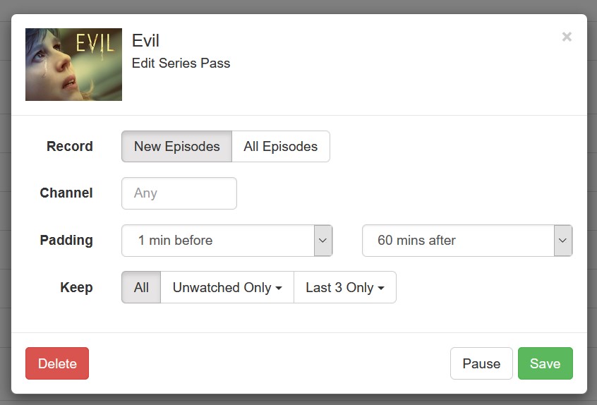 I missed the Thursday night showing of 'Evil' so I created a season pass hopeing to pick up the Sunday night episode and then the regular schedule after that. Since Sunday night schedules are seldom accurate due to football games, I added 60 minutes padding to the end and was going to change it back to 1 minute padding after it recorded the Sunday night episode.