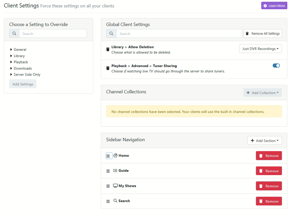 I've tried disabling all sidebar items on the client, but even then only Home, Guide, and Search show up, no My Shows. Any tips?