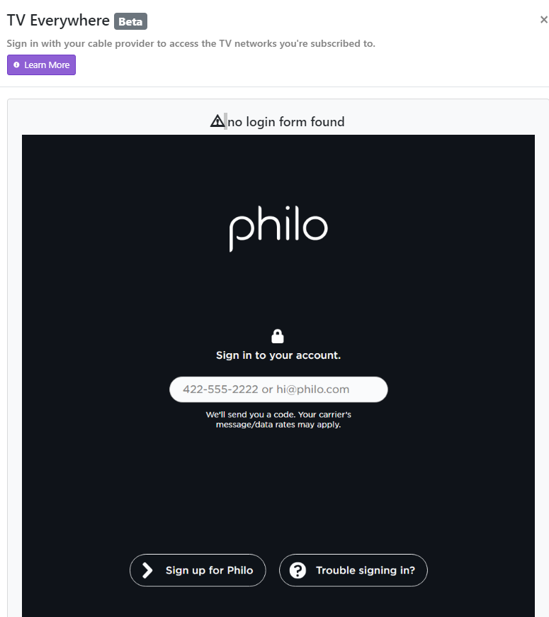I am migrating my server and as I was setting up the new one i have found i can't readd my Philo TVEverywhere channels. When i check Philo as a provider it takes a second and tells me 'No login form found' but then shows me a picture of the login page. Any ideas?