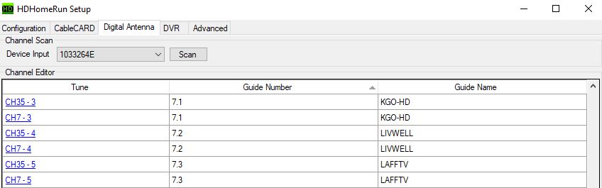 For 7.1 ABC, I'm wondering if the root cause could be related to how HDHomeRun is treating the two transmitters in my area on the same "virtual channel" (this is different from the NBC 11.1/11.3 topic I posted yesterday). See the screenshot from HDHomeRun and how it assigns the same virtual 7.1 to both 7-3 and 35-3. If you look at the Channels guide screenshot, you see only a single 7.1 entry. In WMC, there is a workaround for this scenario - does Channels have a similar workaround? My signal strength/quality for 7-3 is 100%/95% and for 35-3 is 69%/75%.