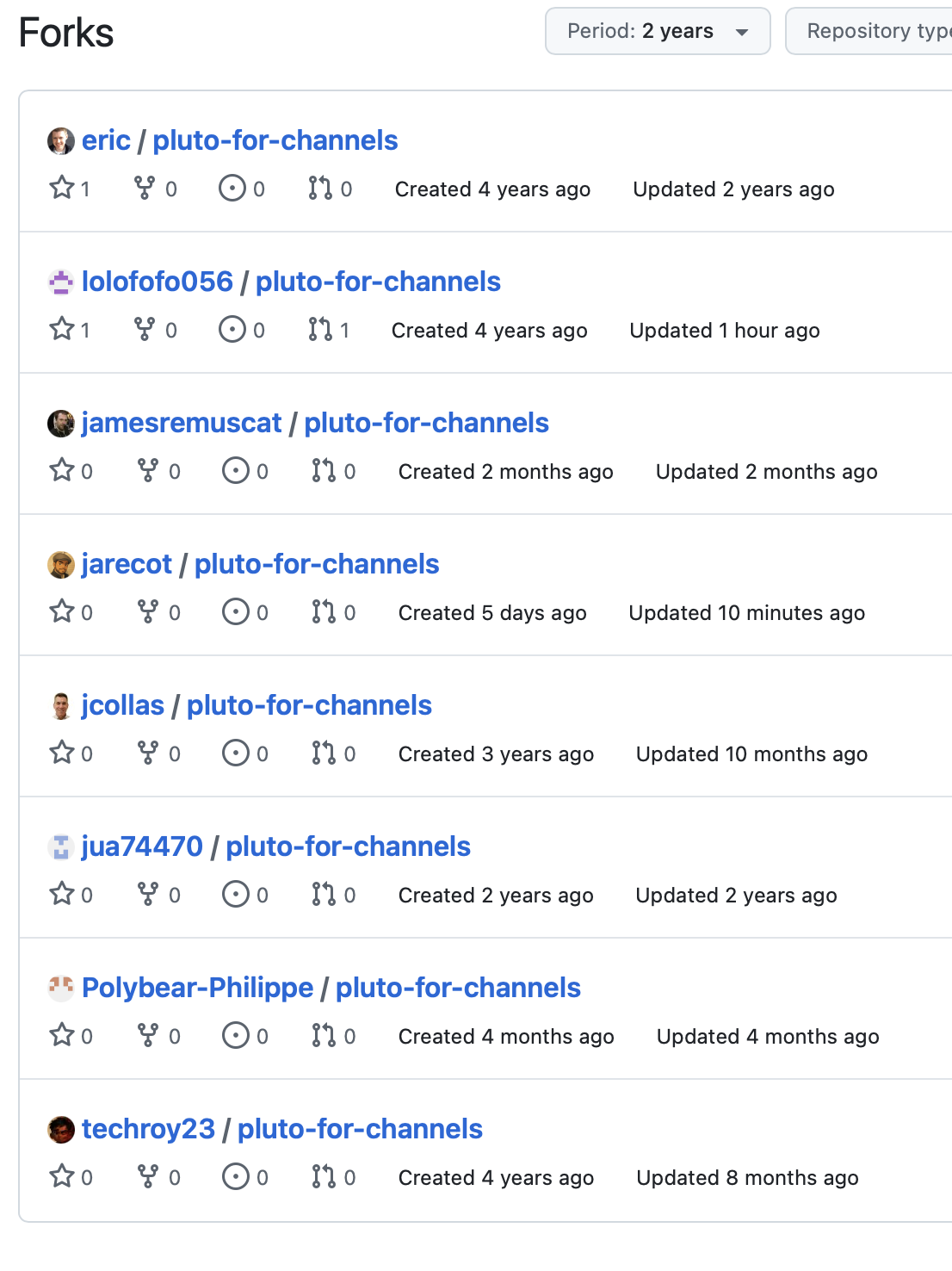 The @joagomez Pluto-for-Channels is written in Python, so was not a fork of your project. @Bobby_Vaughn forked that, and @KineticMan forked that fork. I don't believe there was ever another project thread though, and each was published separately.