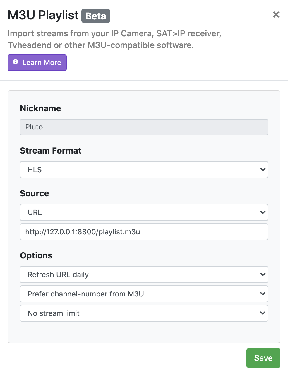 I feel like I'm missing some steps. I read all of the links, github, and many comments. I'm still not quite clear what 'Source URL' to enter for the m3u...does everybody just enter the 127.0.0.1:8080/playlist.m3u so long as we're not using a different port?