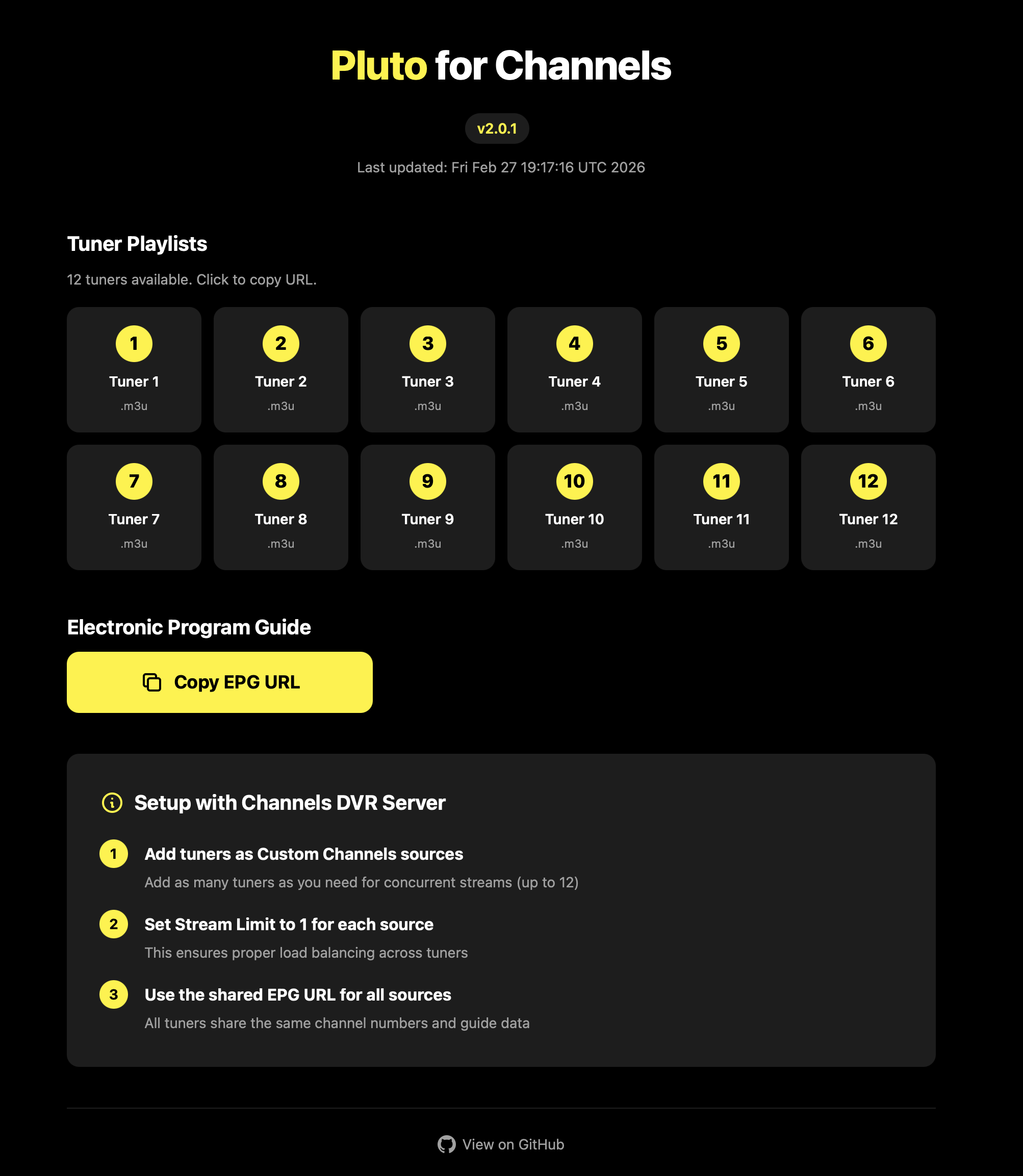 Pluto for Channels 2.0 is available, just pull for the new docker image. It now supports up to 12 tuners. Visit the web page to pull the tuner URLs.