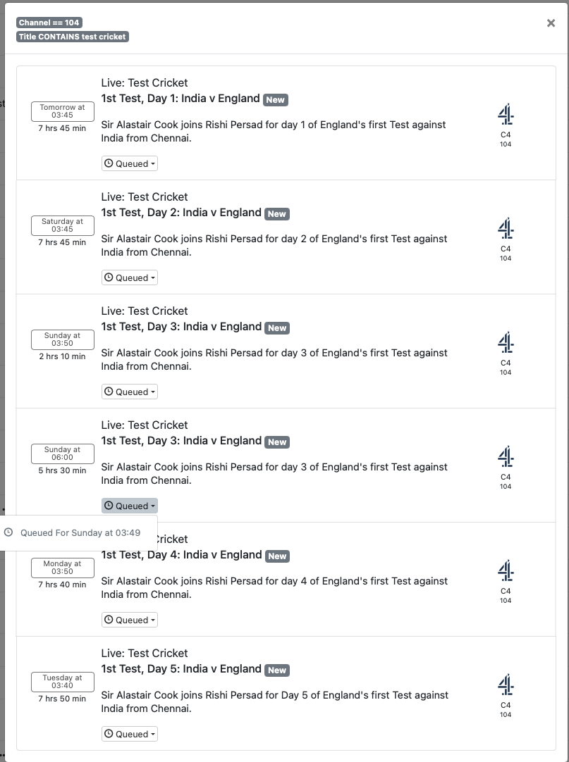 I've got a pass set up to record Test Cricket to be shown on Channel 4 here in the UK.