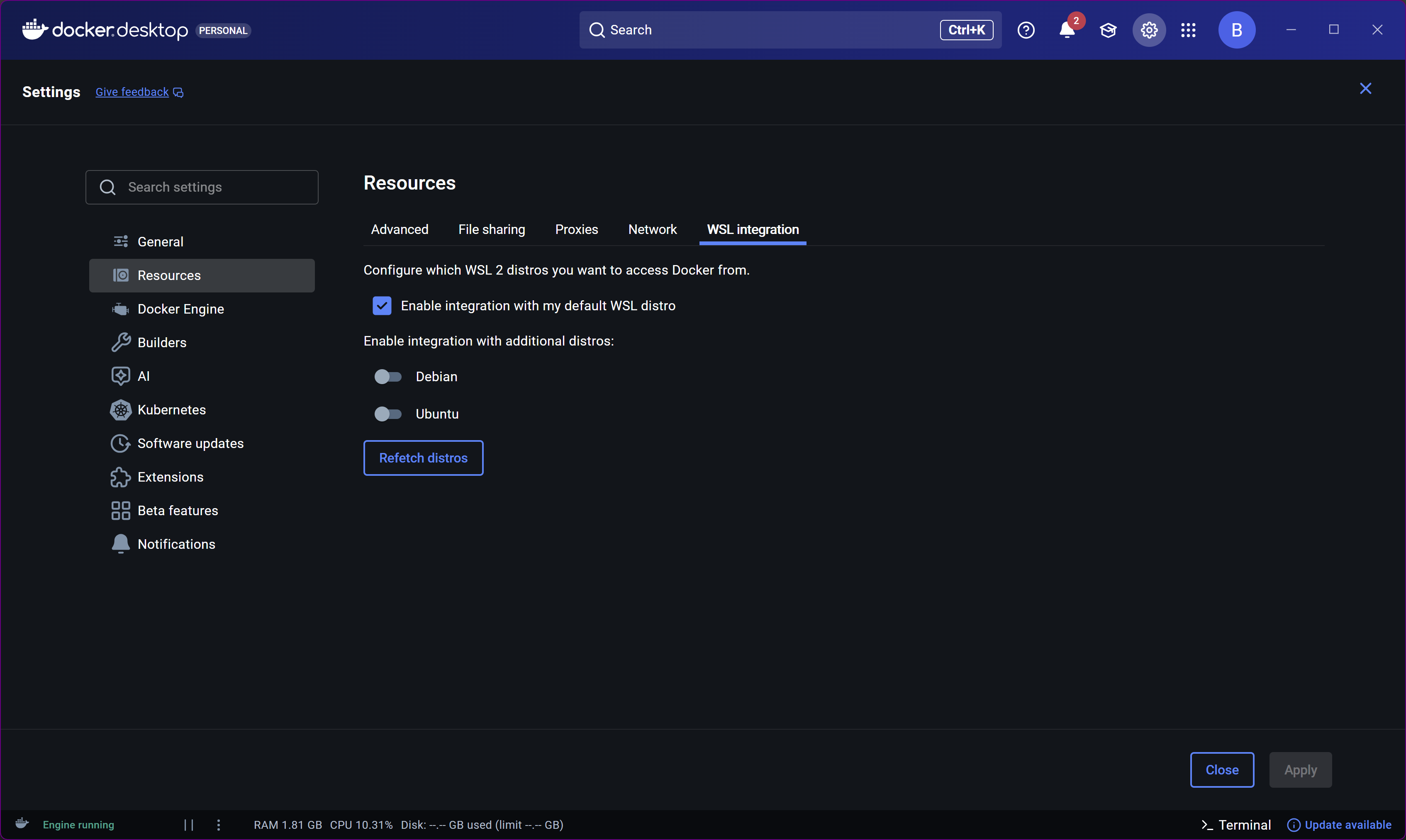 Finally in Docker Desktop, confirm "Integration" is enabled with your default distro: