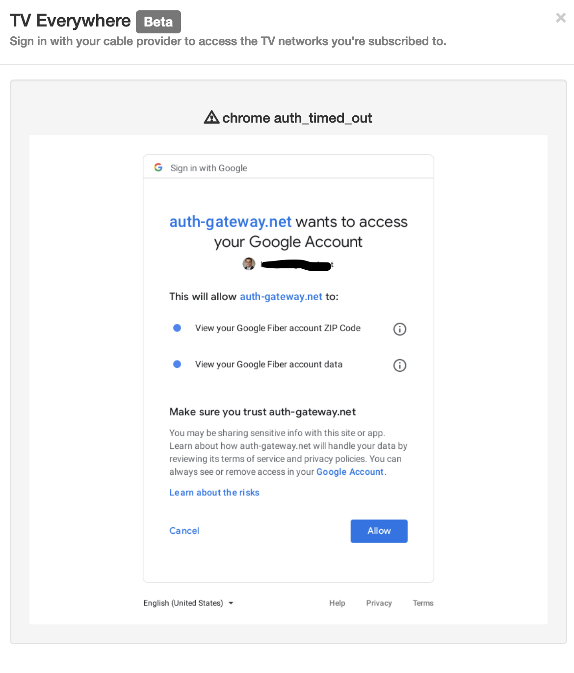 When I attempt to add the Google Fiber source on channels DVR server running on synology it does not work. This is because I need to log in to google services via standard google pop-up just like you are accessing gmail. The ChannelsDVR server sends me the following error.