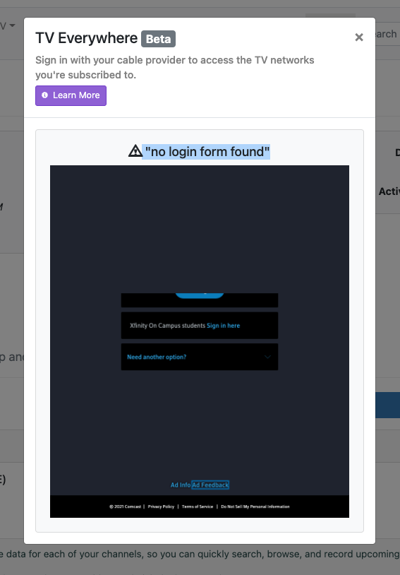 same when i try to watch NBC Sports Chicago - Failed to start stream for ch6164: TVE: "no login form found"