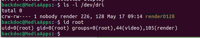 The character device /dev/dri/renderD128 is owned by nobody:render. And, "root" belongs to the render group. (see screenshot below).