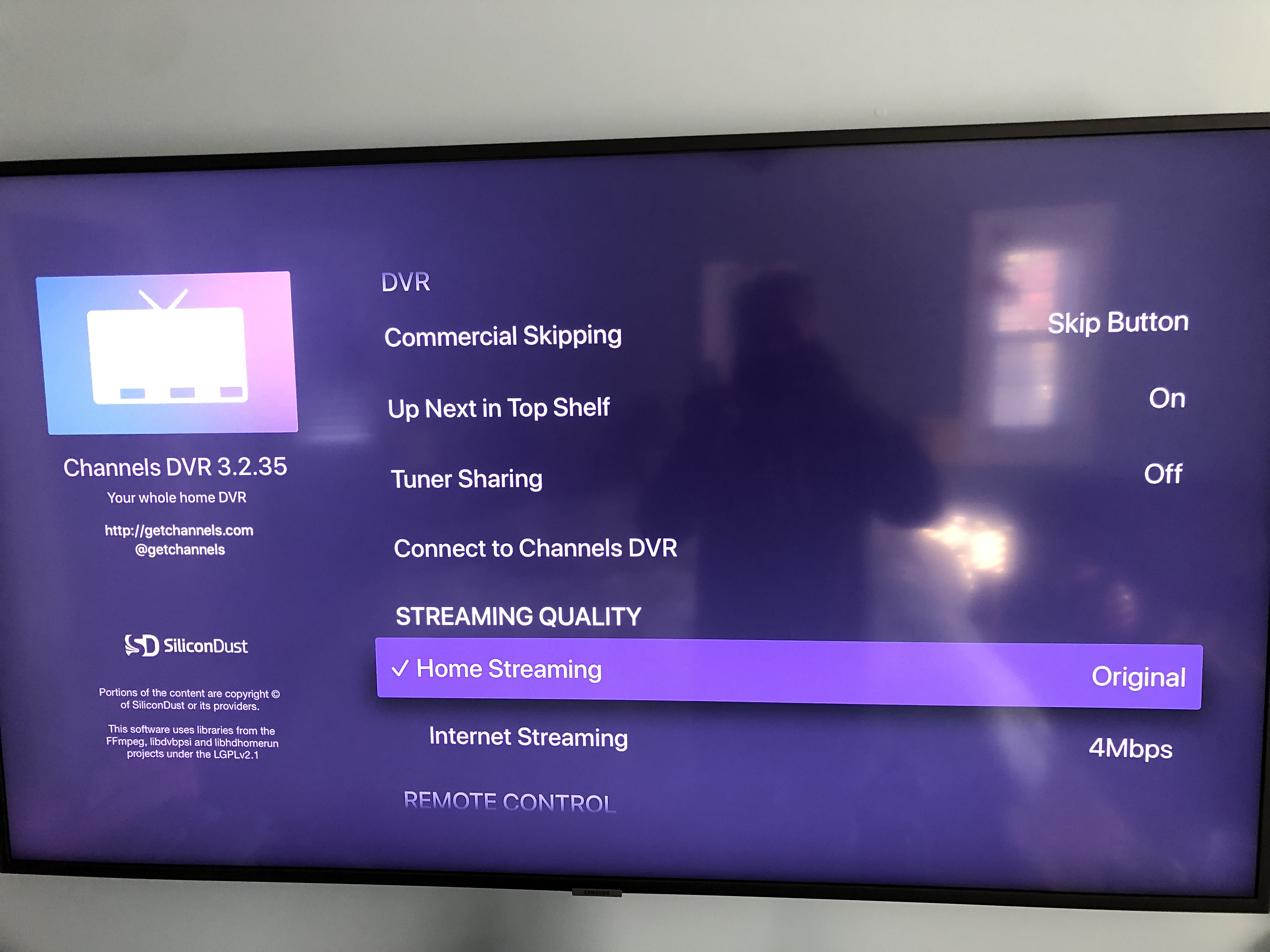 To help you understand - with Tuner Sharing off (as you have), when you watch Live TV, the Apple TV establishes a direct connection with HDHomeRun, and the DVR server is not involved at all. With tuner sharing enabled, the DVR opens the connection to the HDHomeRun, then passes the data on to the client. This is what allows it to to “share”, as other clients or recordings using the same channel will be sent a copy of the same data. This conserves tuners, and I enable it on all my clients. It also requires the server to do some minimal buffering before the data is sent on to you. You could try enabling this option to see how it affects the behavior. It might help. It also might make it worse. As others have pointed out, this is most likely a network issue, so there is still value in connecting via Ethernet to confirm as well.