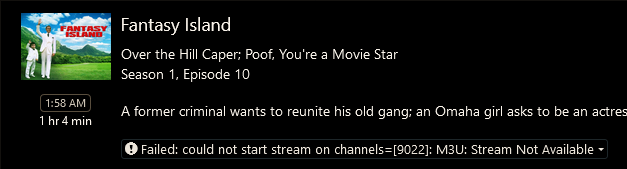 2022/11/20 02:15:35.495342 [DVR] Error running job 1668938280-6 Fantasy Island: could not start stream on channels=[9022]: M3U: Stream Not Available