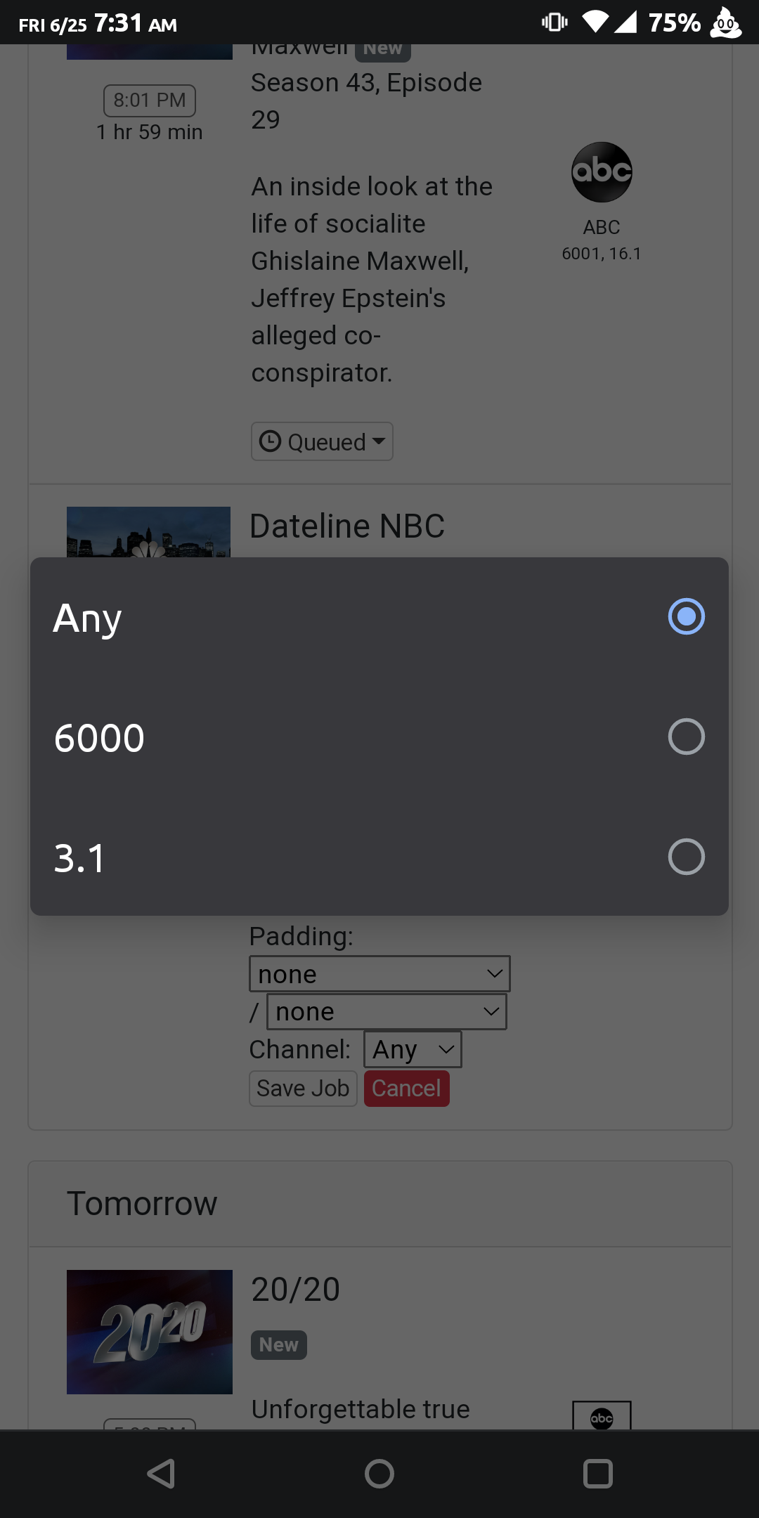 (My first two sources have many of the same channels. To ensure that the proper source is chosen for recording, I have the channels I wish to be used on the lower priority source marked as a favorite. To date, Channels has always chosen the favorite from the lower priority source, even when the same channel is available from a higher priority source, as long as it is not a favorite on the higher priority source.)