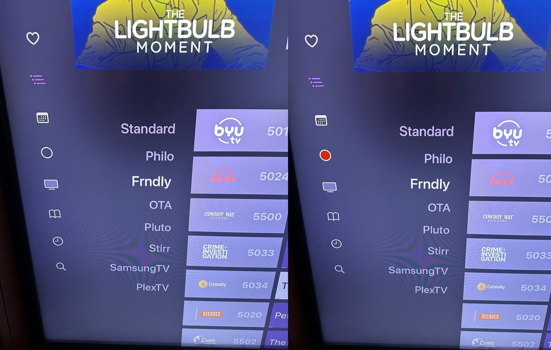It would be nice to have just a simple indicator that displays in the sidebar navigation menu that just lets us know that, "hey something is recording." Maybe just fill in the recordings circle (that is already there now) when recordings are occurring. I always enjoyed this with physical DVRs. Sure, in the guide if you are on a screen that happens to display something that is recording it does have a box with a red background. But most of the time you are probably not going to be on a screen with a currently recording show/movie. You might not even be in a channel collection that has the channel. Or somewhere else.