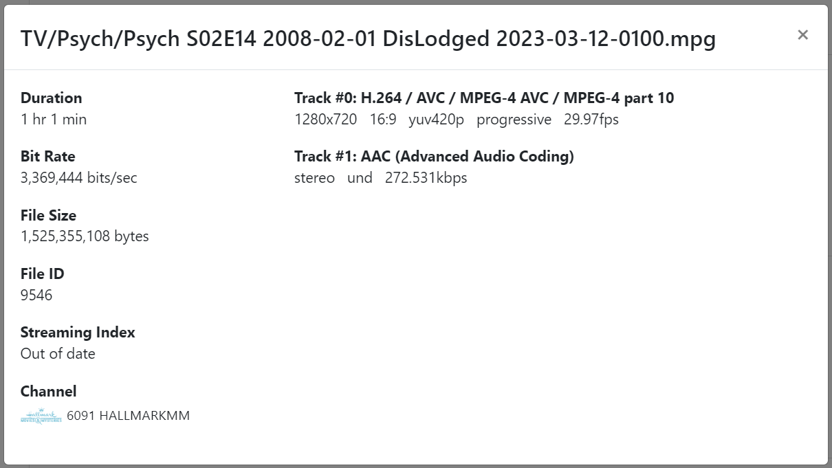 2023/03/12 01:00:00.002262 [DVR] Recording for job 1678600800-269 from TVE-Philo ch6091 into "TV/Psych/Psych S02E14 2008-02-01 DisLodged 2023-03-12-0100.mpg" for 1h0m29.998319942s