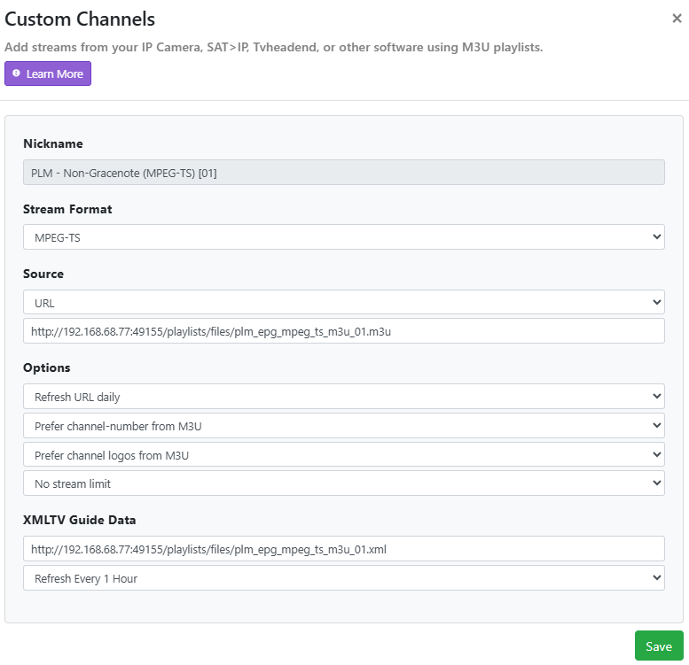 The settings in Channels to pull in the Playlist for Channels custom channel is this:
