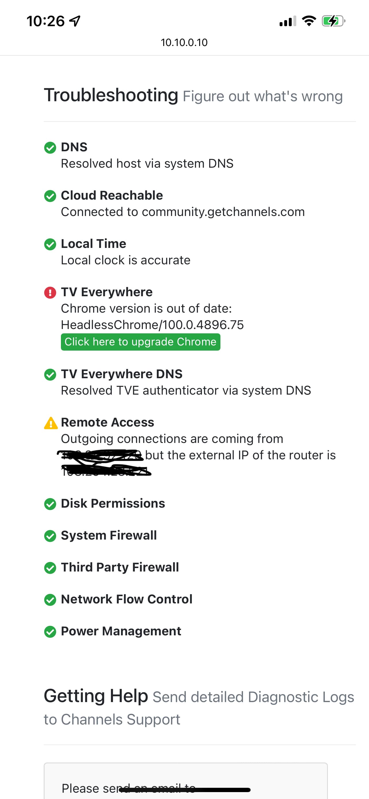 Every time I am away and the Channels DVR app says it cannot connect, I can browse to the 1:1 NAT IP address using port 8089