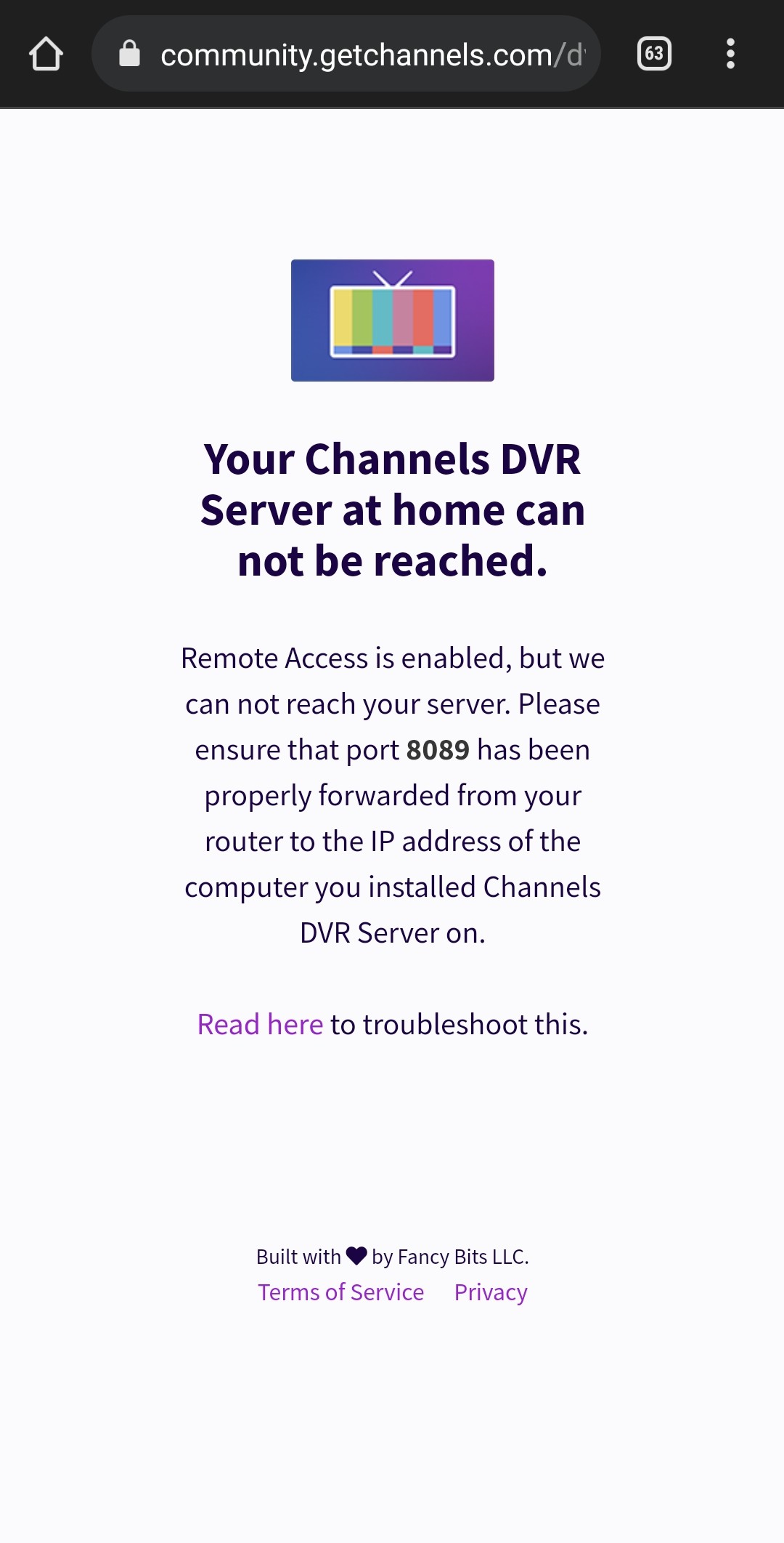 When it authenticates I either seem to get the error that channels dvr server at home cannot be reached and then if I refresh I can get into the app. When I get in either recordings are not showing up, or the guide and tv tuners or both. I do not seem to have full access. The correct port is opened and confirmed by portchecker.co inside my network and remotely. When I run troubleshooting every fifth time or so it will say no remote access which seems to be weird. I tried uninstalling and reinstalling from scratch which did not help. Is there possibly an error on the channels server side?