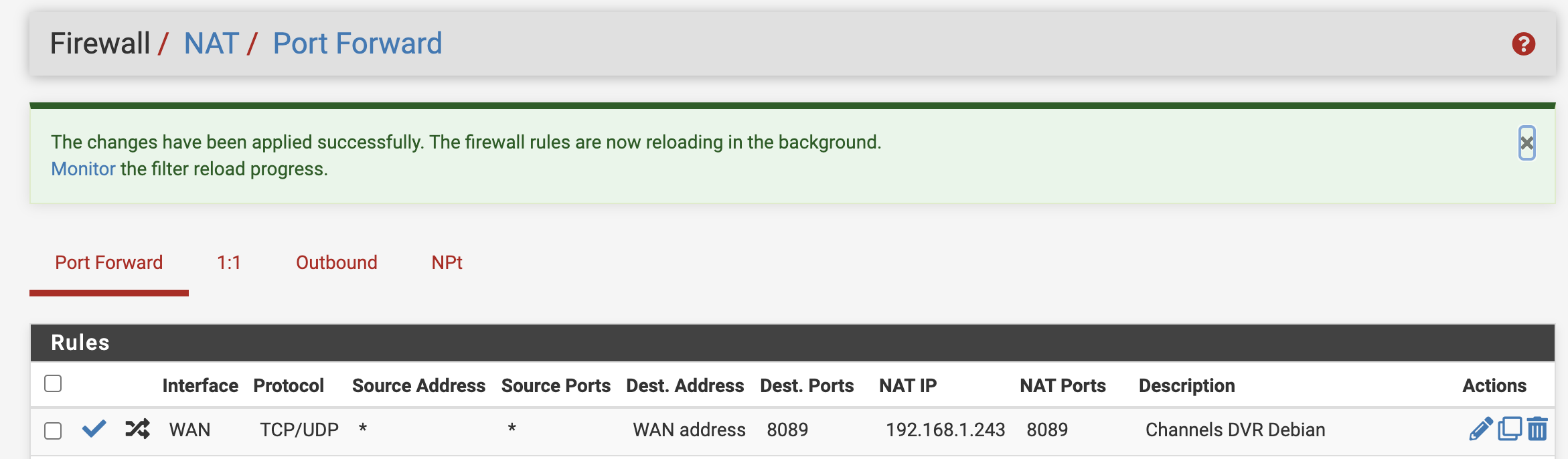 I have uploaded the screenshots from my pfSense firewall. I believe I have the Firewall and NAT rules set up correctly, and if memory serves, I had streaming successfully working when I first set up this instance of Channels DVR.