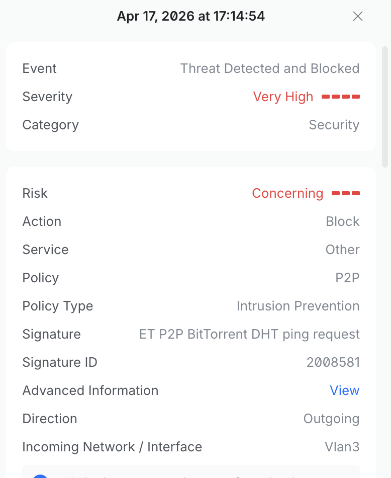 Post some screen shots and give more information, cause that is extremely vague and not really helpful at all. What Service, Category, Policy Type, Signature ID and threat etc does it state...it gives tons of info other than what you state.