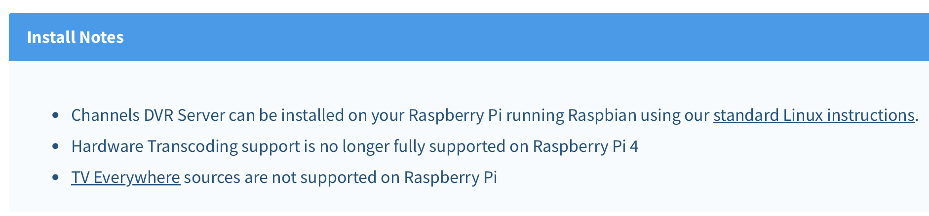 However, now that I finally got around to attempting to set up a Channels server on a Pi with Raspbian I see new information on the server hardware page saying "[TV Everywhere] sources are not supported on Raspberry Pi."