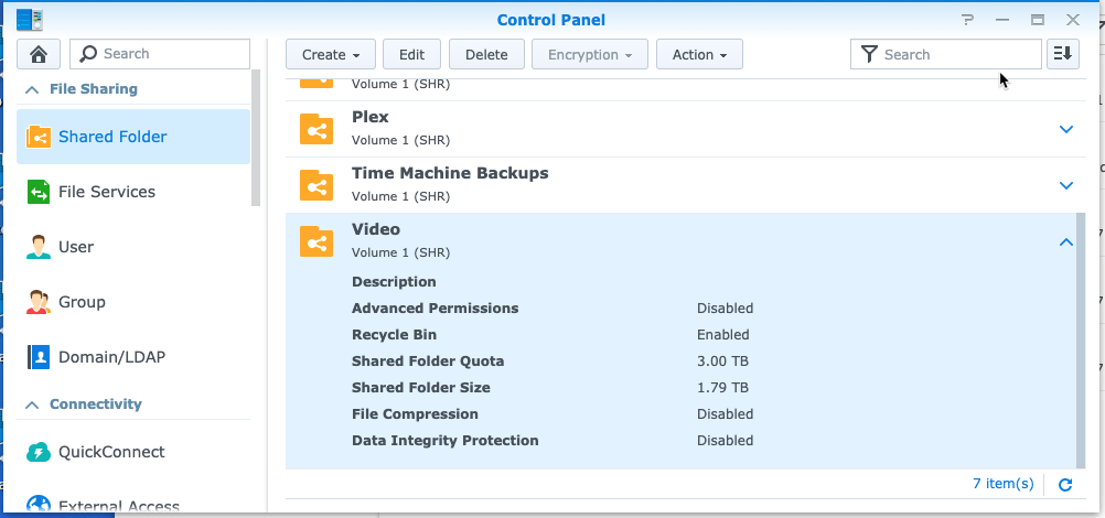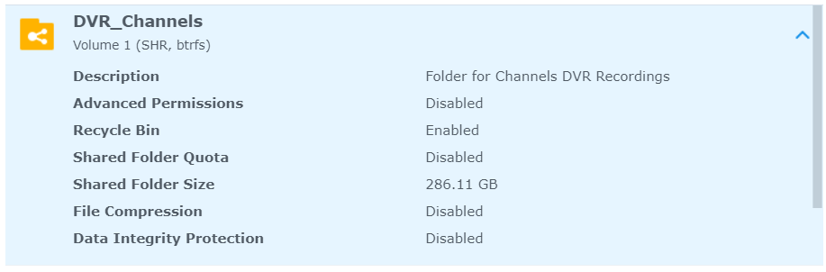 Hi, I have a 2 month old Synology DS918+ NAS with 2TB Usable storage. I use the NAS for ONLY Channels DVR. I have 73 recordings and just about all are 1 hour long. Lets assume each recording is 5GB. 73 x 5GB = 365GB. Why is chaannels DVR telling me I am at 98% capacity if I have 2TB usable storage? Synology console also says I'm at 98%.
