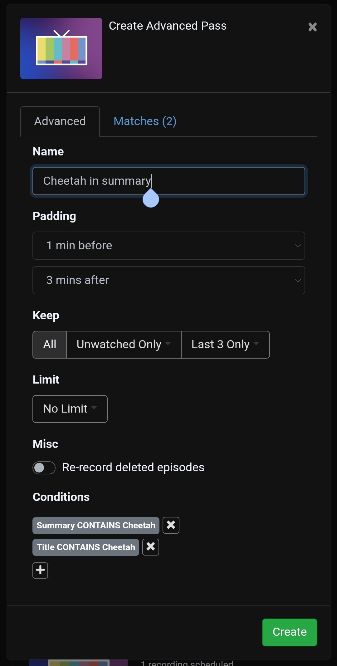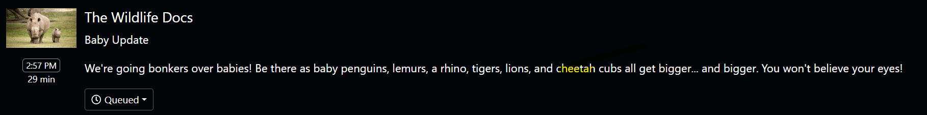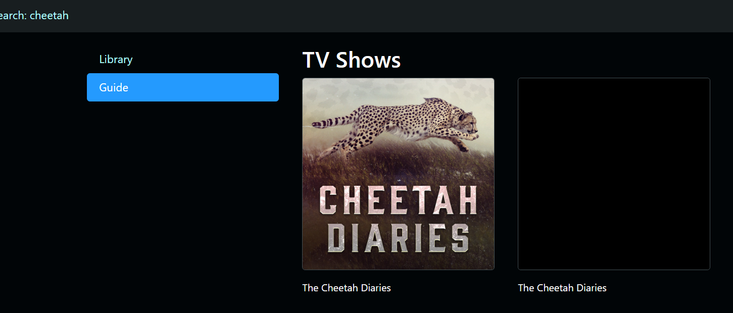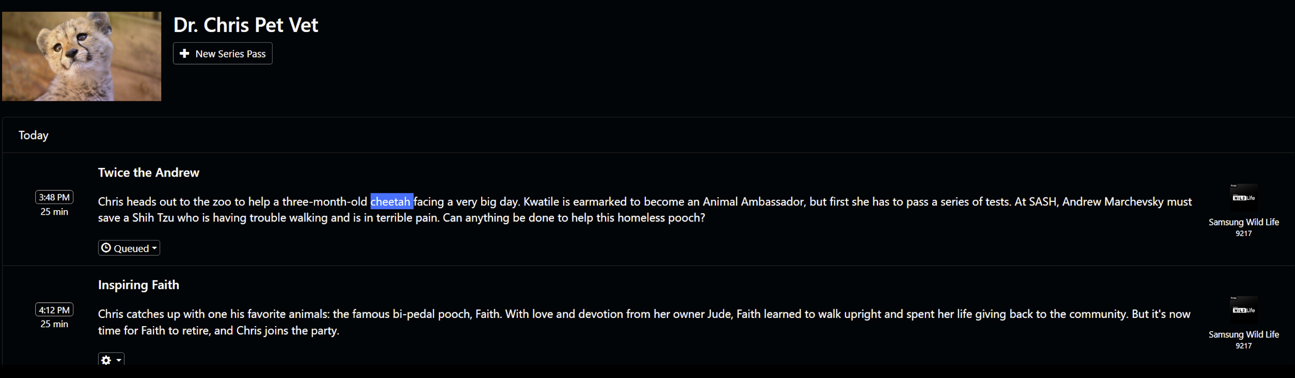But, manually browsing one of many channels, i find programs that have "cheetah" in the program description, but the title of the show does not have the word in it, thus, search does not find it.