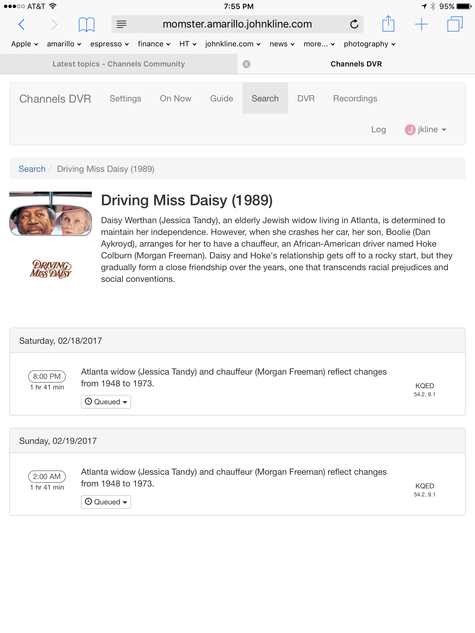 Example, see attached. Search, select movies, see "Driving Miss Daisy". Notice it's on 54.2 (SD) and 9.1 (HD). I can't choose. So I hit record. Then I have to check the queue, notice it's recording on 54.2—which I don't want, delete the queued recording, go find the movie in the guide on 9.1 and hit record again.
