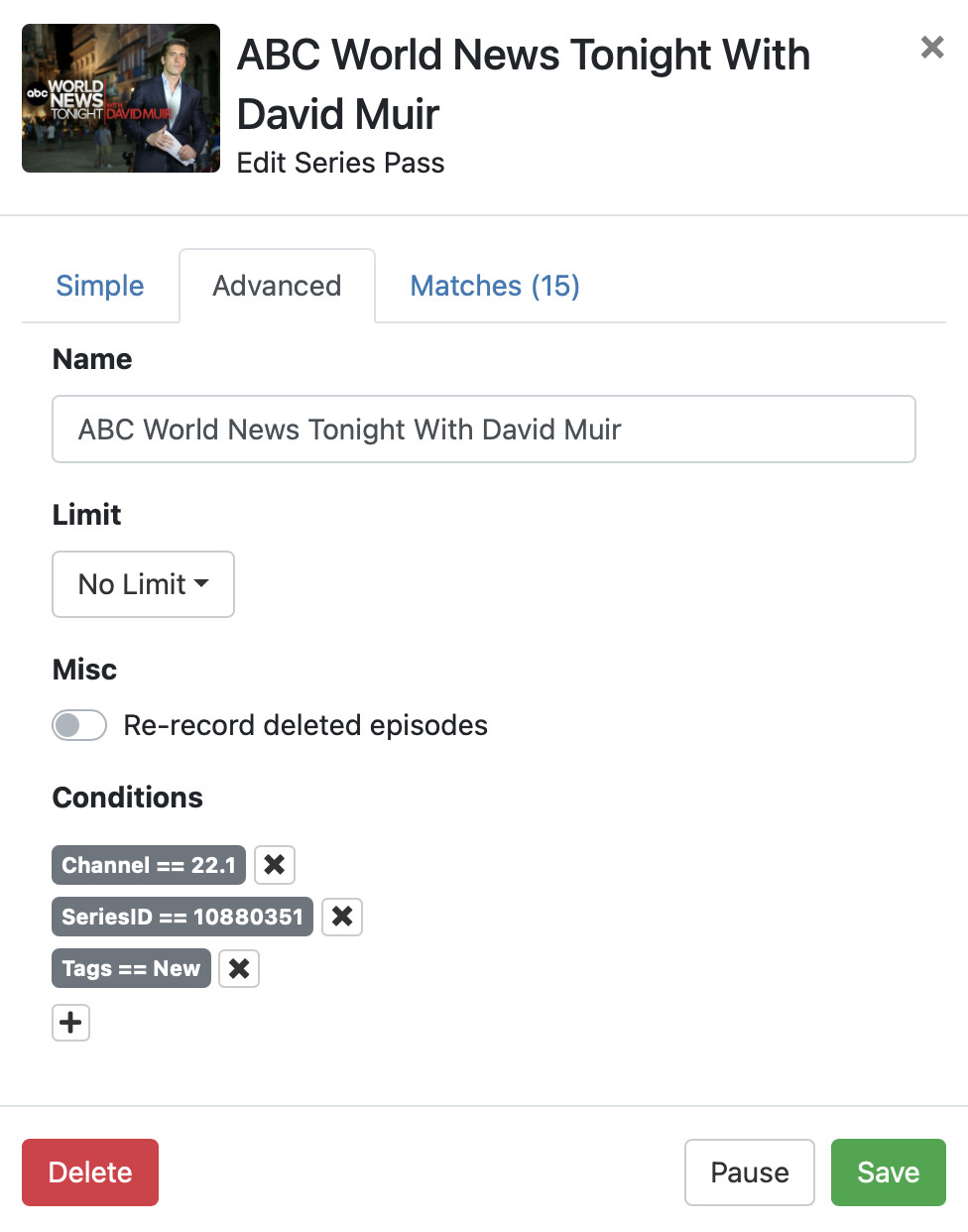 Thanks. Since I changed to Channel < 9.2 and Channel > 9.0 in Advanced, it hasn't switched back to Channel == 9.2 ... but it's only been two days. (Also hasn't recorded either of the episodes that aired in the meanwhile.) Still baffled as to why it kept doing that. How might I enable verbose logging and view the activity logs?