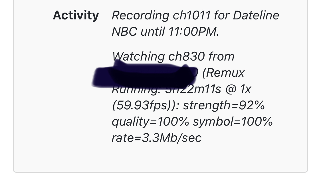 I’m not sure why, but the server isn’t showing all activity for active tuners. I’m running version 2021.05.05.0011. Here’s what silicon dust shows active on my tuners (correct) and here’s what Channels Server is showing (missing a tuner).