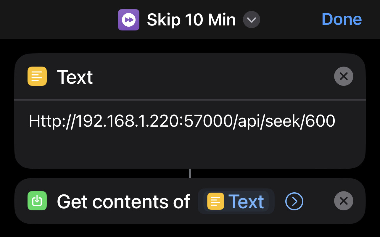 I see that Siri shortcut options for commanding another device are “seek” and “skip” forward and back. Seek jumps by the duration set in settings, and skip jumps by chapter.