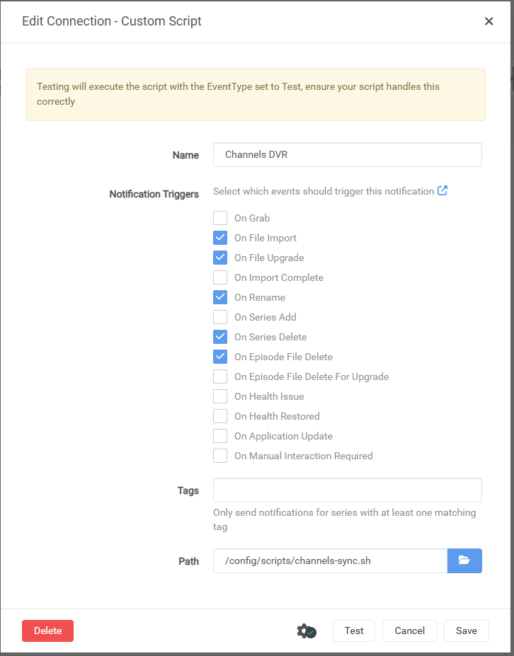 - On File Import, On File Upgrade, On Rename, On Series/Movie Delete, On Episode/Movie File Delete