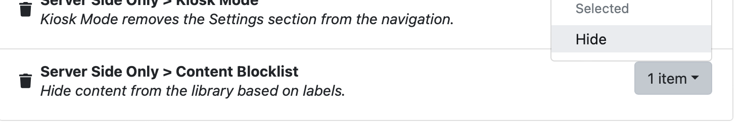 Then in the Clients menu on the web UI, I select the client that I want to change the Server Side Only -> Content Block List. Then select the "Hide" label. When that is selected, the Shrimp folder videos do not show up as visible on that client UI.