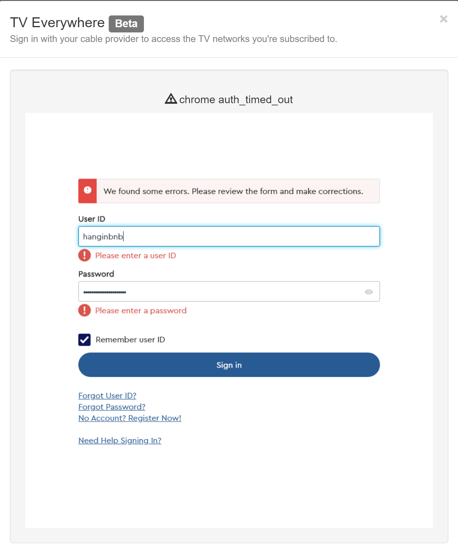 So I'm experiencing a strange issue. I started losing channels on my Cox TVE Login and I decided to delete and attempt to re-authenticate. What's odd is that it won't login and shows the following screenshot. It, for some reason, thinks that there's no credentials being filled and thinks the fields are blank?