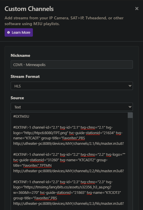 Using a Custom Channels setup in my local CDVR, I can then add these remote channels to my local guide with an setup like this:
