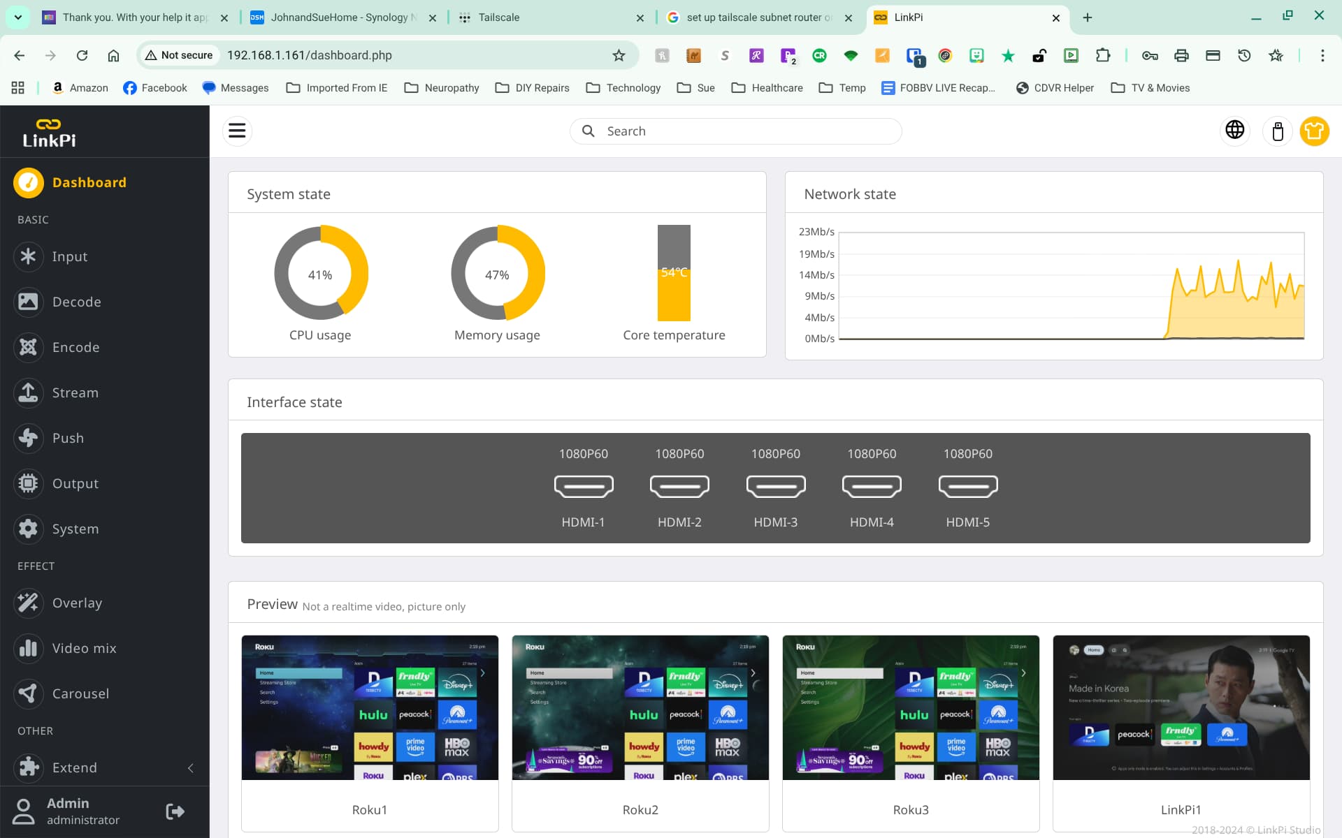 So what you need to do is when you are home go in to your router and change your subnet to something else. Not 192.168.1.0 something like 192.168.111.0 to prevent conflicts when you are on another network that also uses 192.168.1.0. Then in your other home set the network to something else like 192.168.112.0 for example. If you are somewhere that also uses 192.168.1.0 as their subnet and your device such as a linkpi has the same IP address as something on that network you won't be able to access it due to the conflict. If you have two homes on the same tailnet they need different subnets to avoid conflicts.